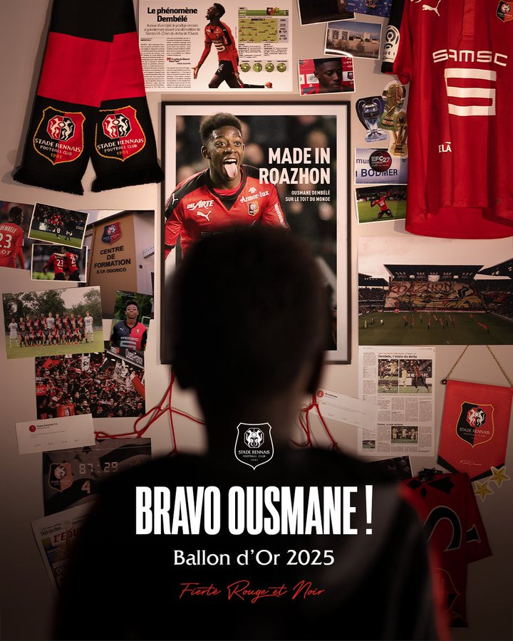 母队雷恩官方祝贺登贝莱: 青训学院的耀眼天才, 伟大的成就
