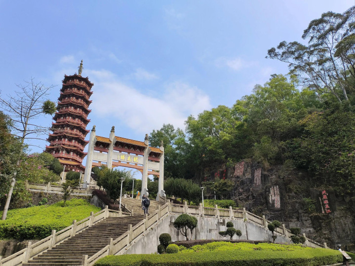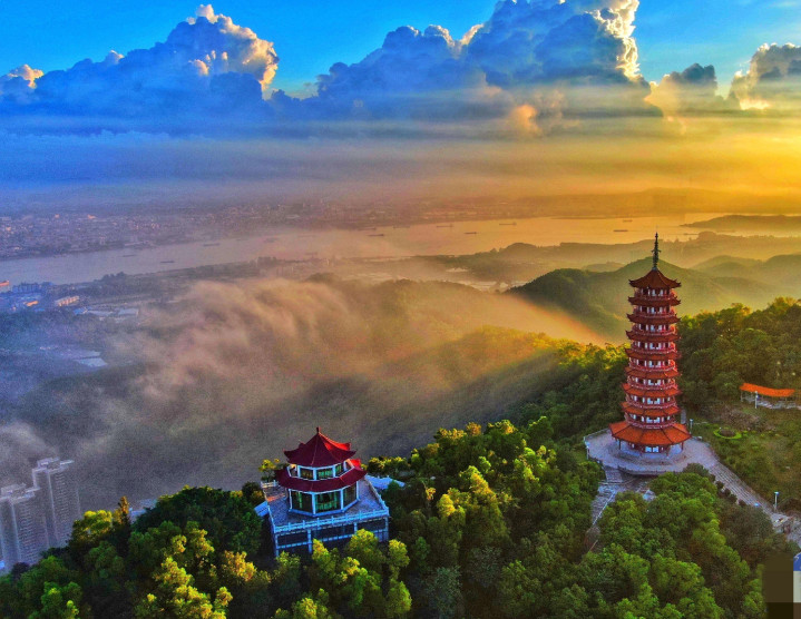 大雁山:爬到“纪元塔”时,刚好赶上日落。塔是仿宋的九层楼阁式,红柱绿瓦,飞檐翘角挂着铜铃,风一吹“叮铃叮铃”响,声音脆得像碰碎了冰。站在塔下往下看,西江像条碧绿色的绸带,飘在大地上,运沙船拖着长长的水痕慢慢驶过,船尾的浪花泛着白;远处的沙坪城区亮起点点灯光,像撒在黑丝绒上的碎钻。
