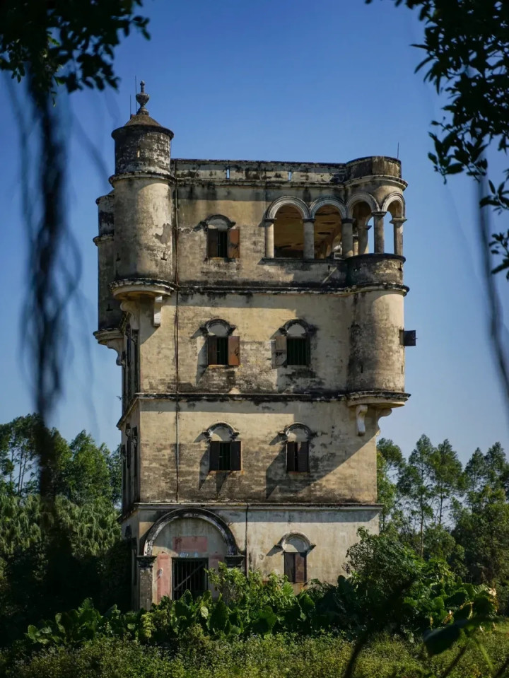 龙口碉楼群:走进碉楼,木制楼梯踩上去“咯吱咯吱”响,像踩在老唱片上。二楼的墙上挂着老照片:穿西装的华侨站在南洋的椰子树下,梳着麻花辫的妇人抱着孩子在碉楼前微笑,还有张黑白照,是碉楼刚建好时的样子——周围全是稻田,碉楼像个孤独的哨兵。村头的“五福楼”更气派,楼顶有个圆形瞭望台,像戴了顶帽子。李爷爷说,这楼是五个华侨一起建的,所以叫“五福”,寓意“五福临门”。