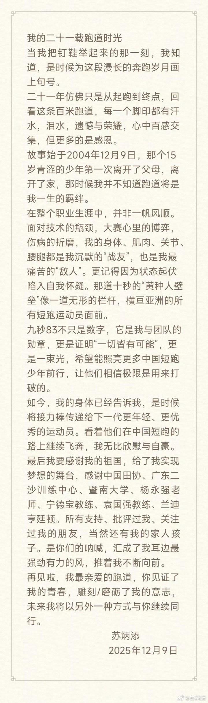 随后,苏炳添在微博发布长文《我的二十一载跑道时光》。