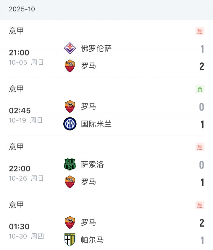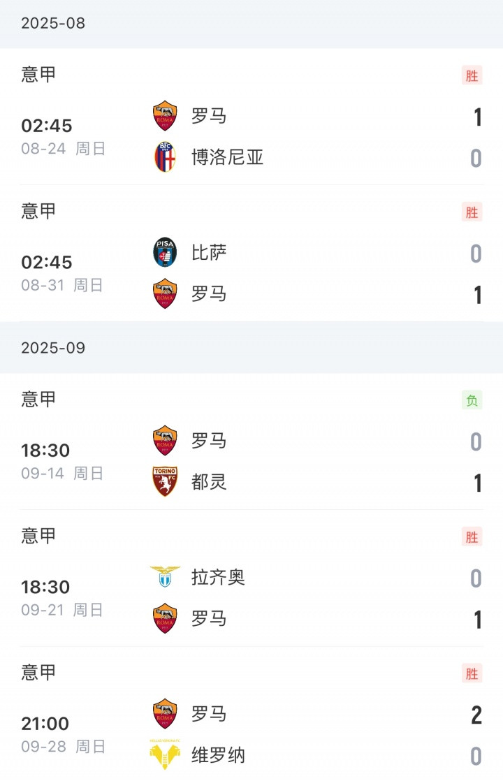 而2个负场中,罗马分别都是以0-1的比分败给都灵和国米。