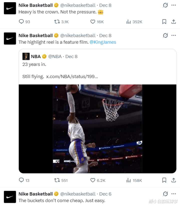 实际上即将年满41岁的勒布朗刚刚打出赛季最强一战,他在12月8日击败费城的比赛中拿到29+7+6+1+1的数据,而且在决胜时刻连拿10分帮助湖人取胜,Nike官方写道:欲戴皇冠必先承其重。大家应该可以清楚这句话的含义。