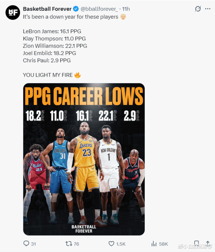 北京时间12月9日,美媒BF晒出五位球员本赛季场均得分:詹姆斯16.1分、恩比德18.2分、克莱11分、锡安22.1分、保罗2.9分,美媒写道:这些球员本赛季状态低迷。