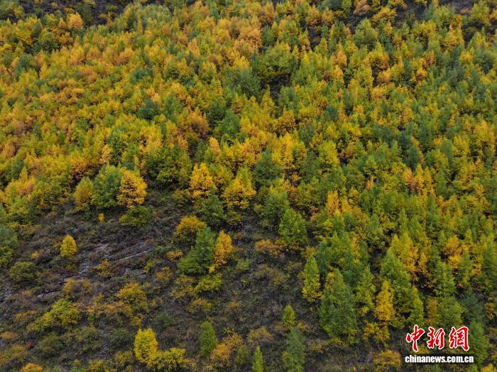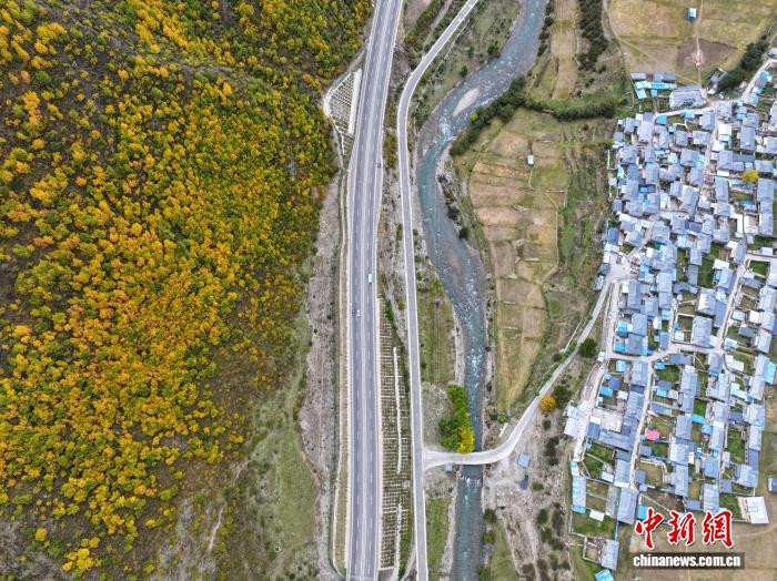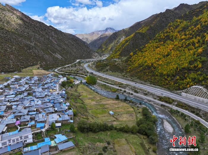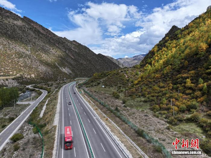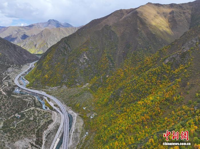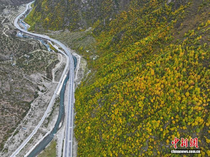 10月1日,西藏自治区林芝工布江达县秋色渐浓,拉萨至林芝的高等级公路沿线成“移动画廊”。中新社记者贡嘎来松摄