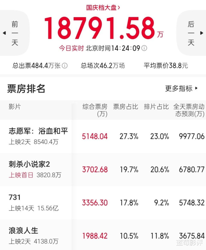 9月30日首映票房狂揽3372万,稳居全国票房第一,次日恰逢国庆假期,该片票房数据更是一路狂飙,AI预测该片单日票房高达9977万左右,直接断层领先。