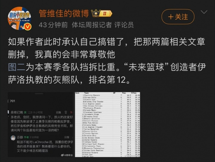 管维佳晒出NBA官方数据,显示伊萨洛执教的灰熊挡拆使用率实际排名联盟第12(非“降低挡拆”),直接证伪苏群论点。指出斯普利特从未在伊萨洛执教巴黎篮球队时担任其助教(实际当时斯普利特在火箭队执教申京),质疑“门徒说”为虚构。